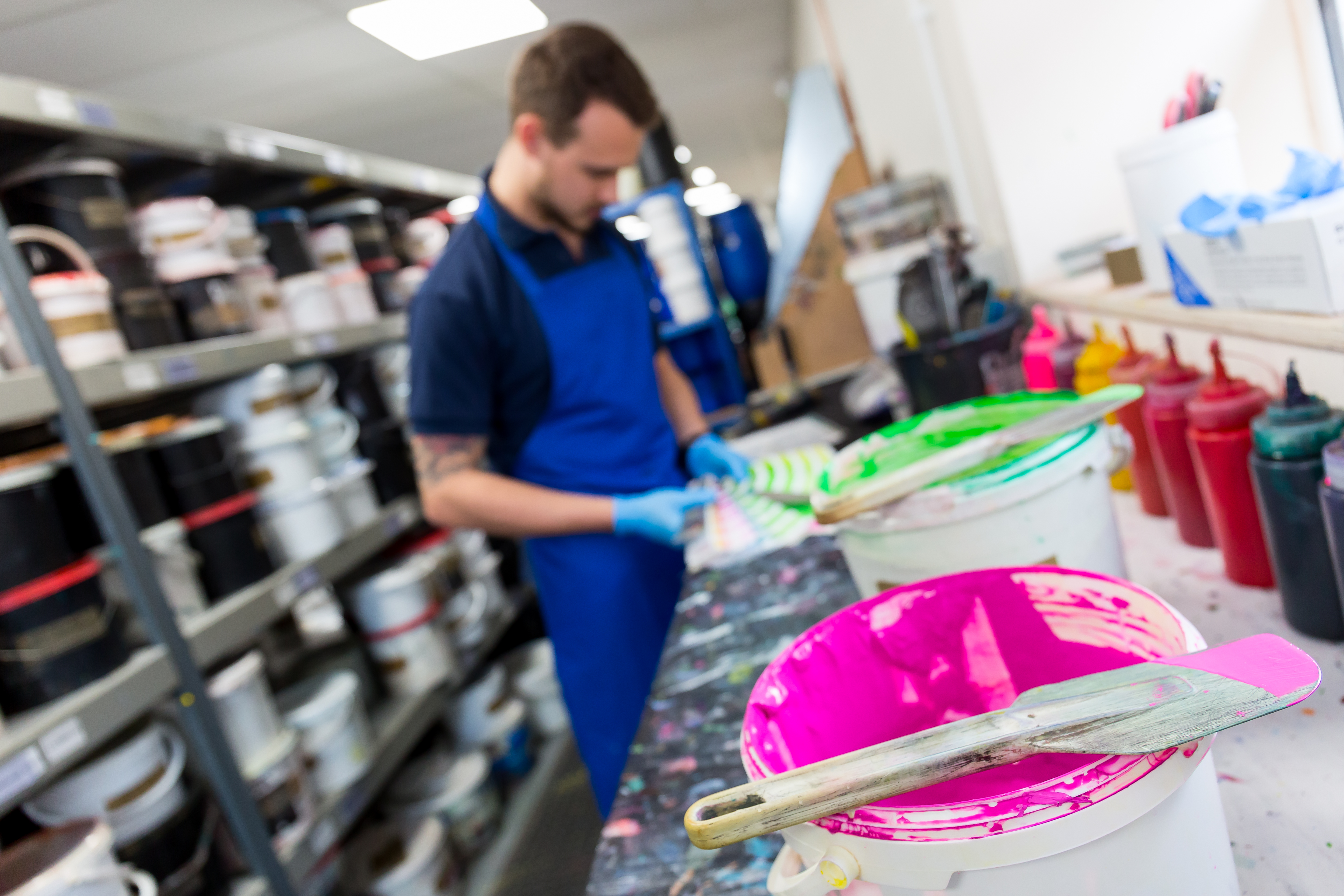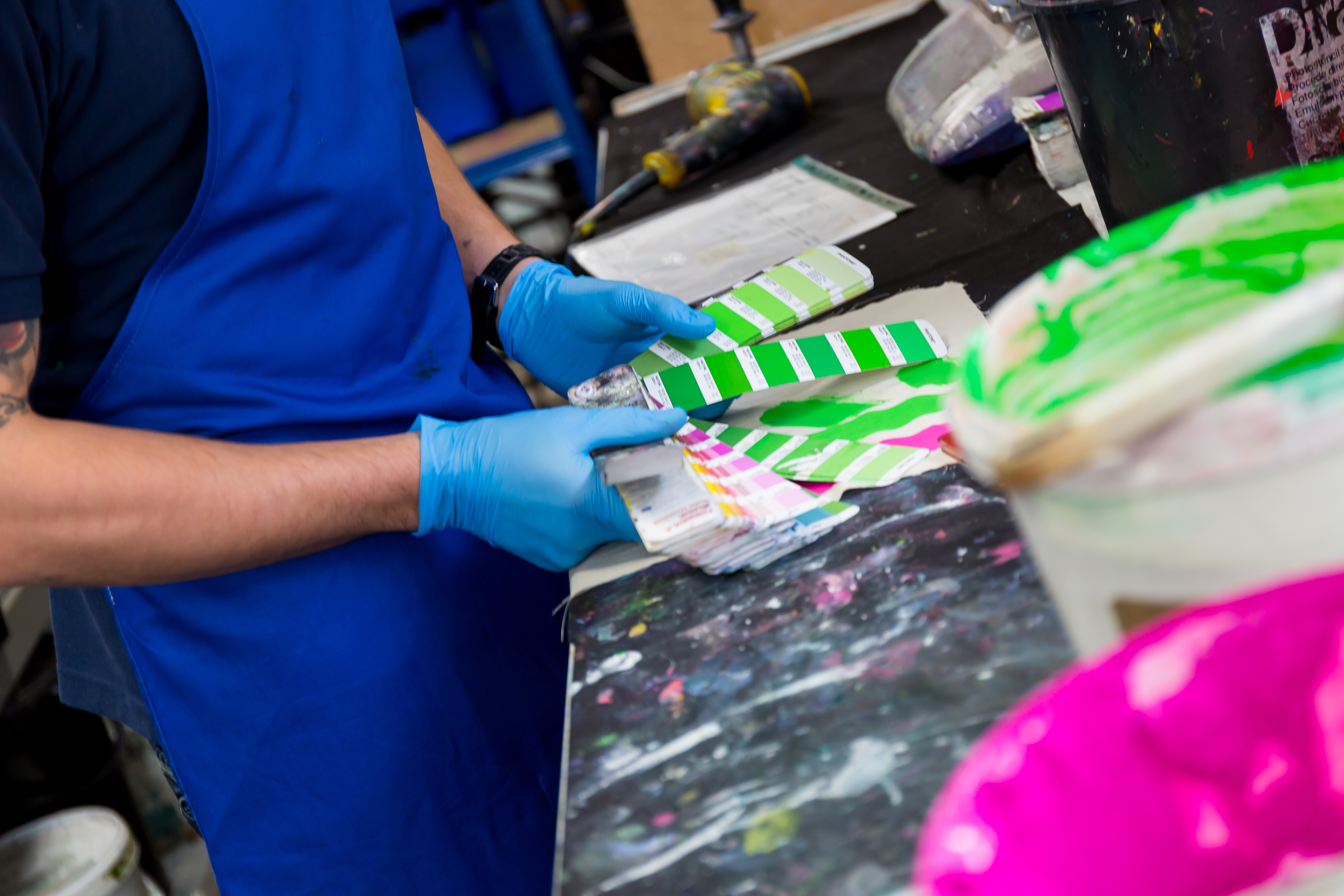We use water-based inks (no that doesn’t mean it will wash off!), All inks for screen printing are prepared in-house by expert colourists, so we are able to match Pantone® references, or to a colour swatch if you have a particular brand colour which does not match a specific Pantone® colour. We recycle inks when creating a new colour to minimise waste and keep the process as efficient as possible.